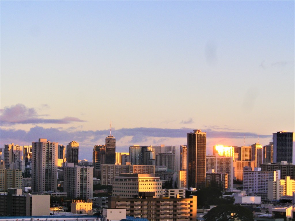 健太家のラナイから見たホノルルの夕景。ハワイ・コロナ情報はハワイ報知新聞休刊でお休みです。