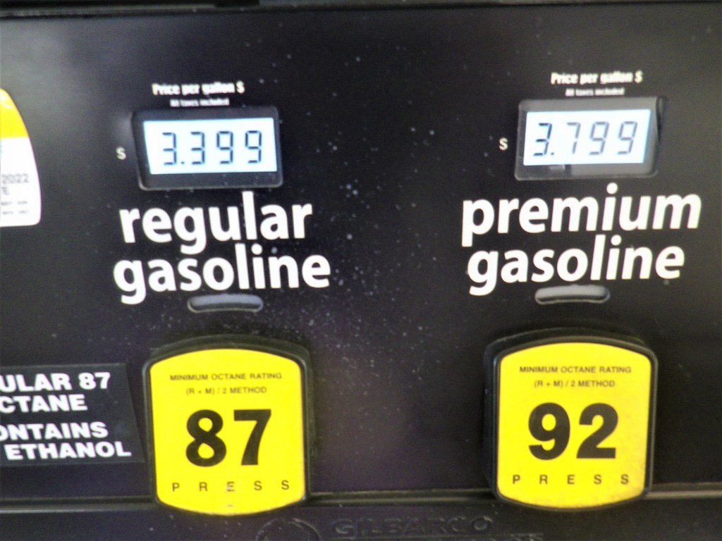 カスコのガソリン、レギュラー1ガロン (4リッター)3ドル40セント、ハイオク3ドル80セント。