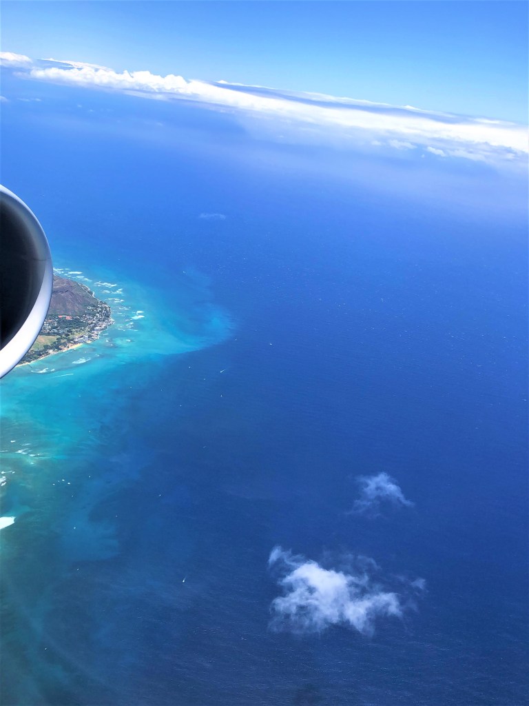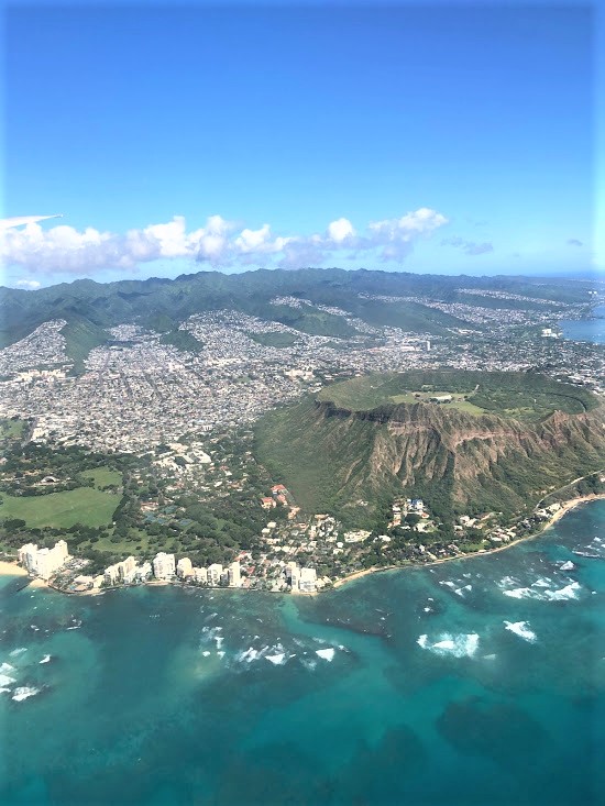 エンジンに重なってダイアモンドヘッドがちょっぴり!カピオラニ・パークも一寸、見えるね。