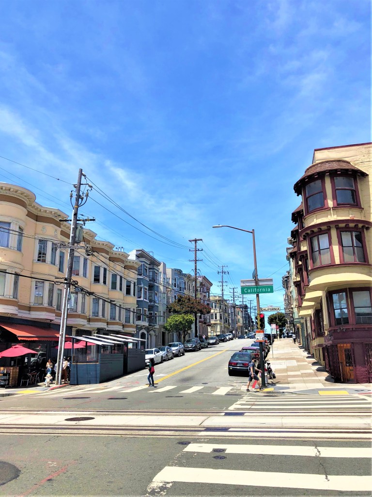 トンマはサンフランシスコへ。手前の線路はケーブルカーだけど、今はコロナで走っていないそうです。左の赤い屋根イタリアン・レストランが美味しいそうです!!