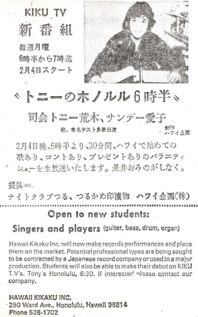 ハワイ報知新聞の広告。キク・テレビで「ホノルル6時半」ショーに出演する健太。