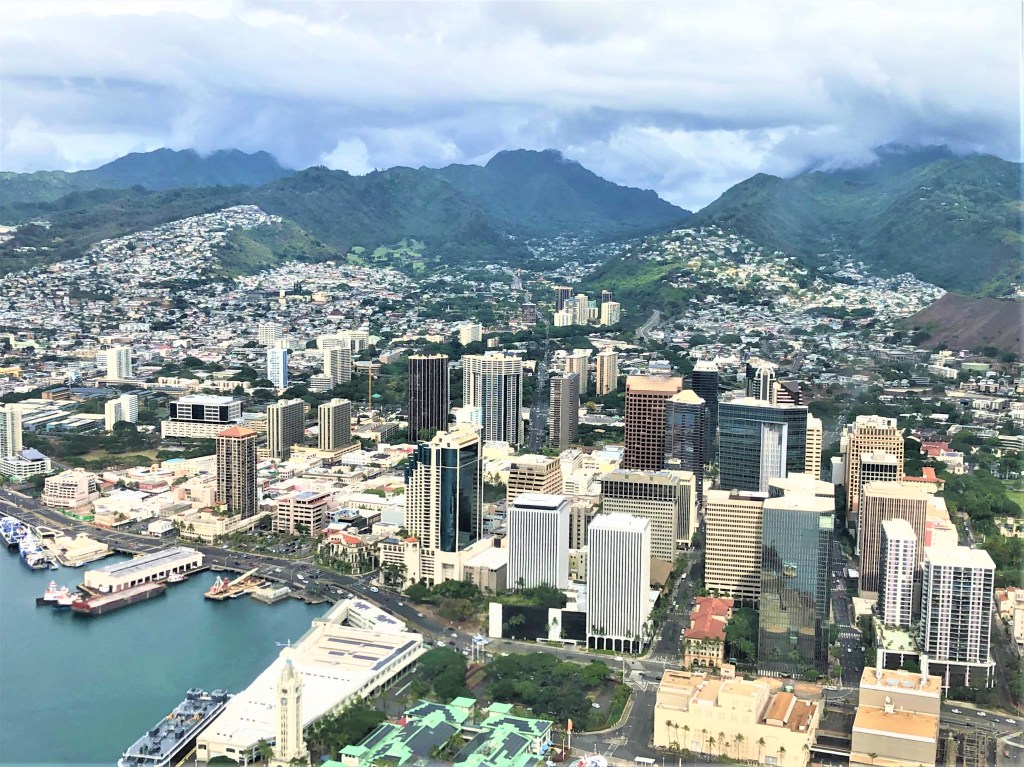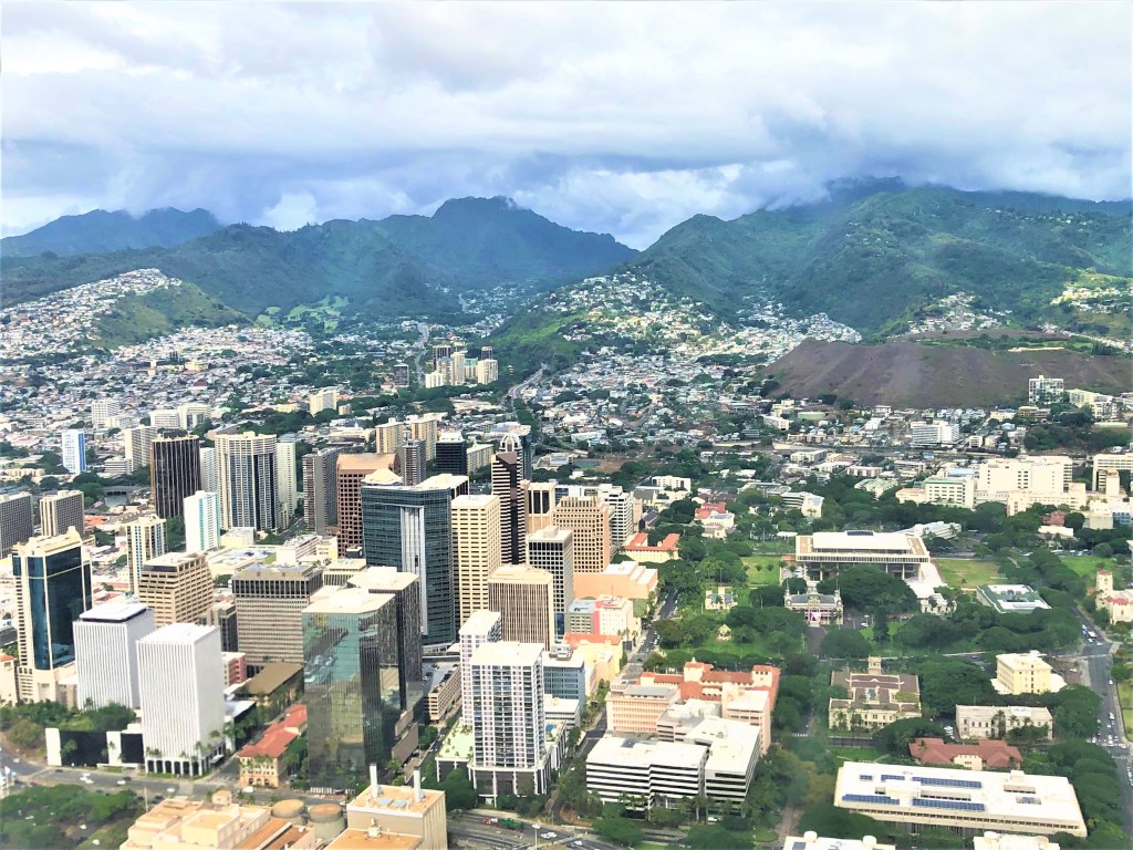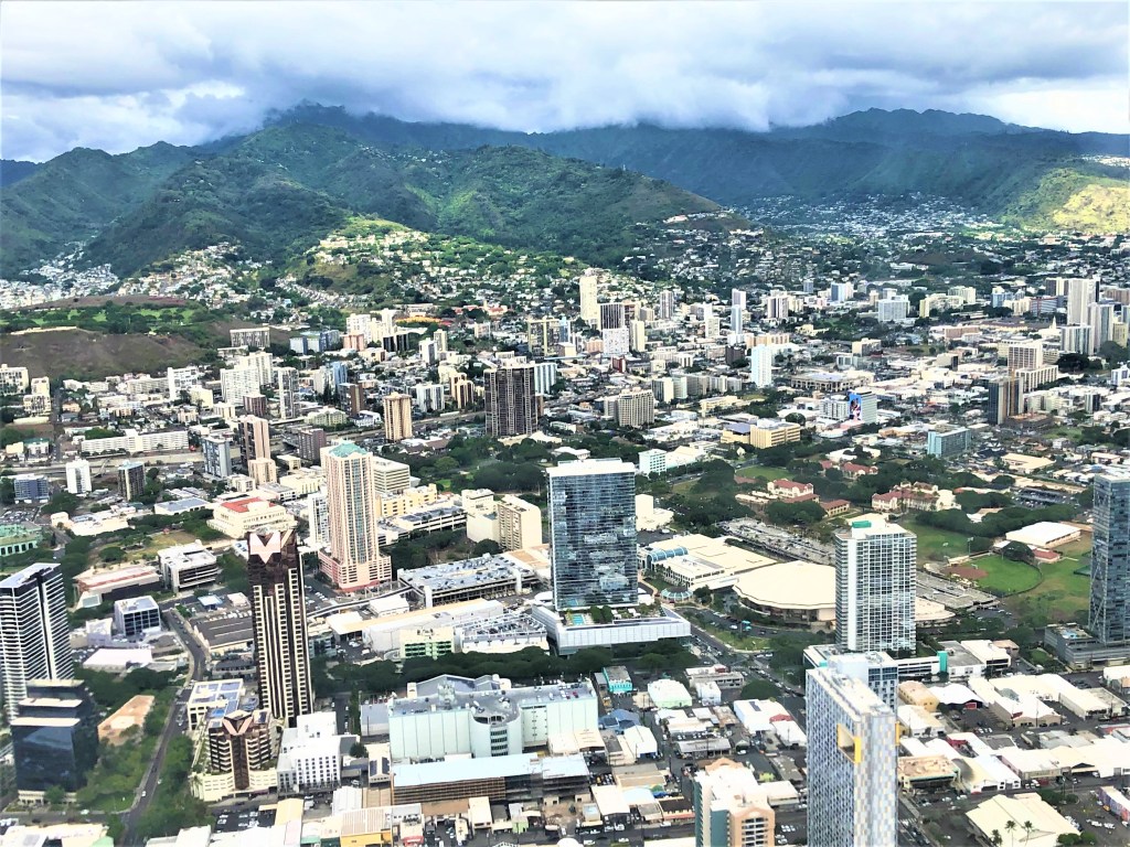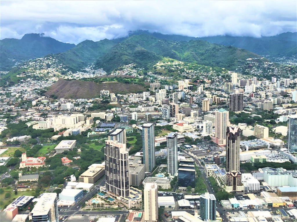 そのちょっと左側から、、。ビル群の向こうの緑はアラワイ・ゴルフ・コース。