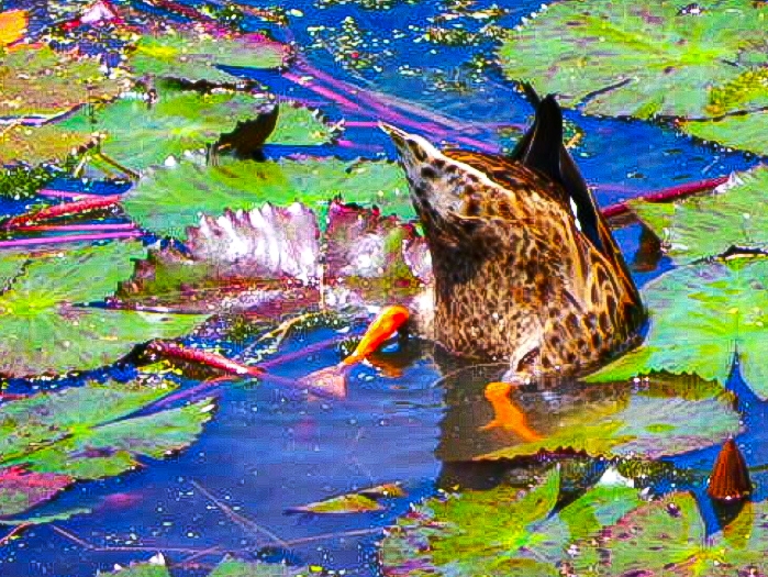 Photoshopの練習でスマートシャープを使って見ました。ピンボケ写真だったけど凄くくっきり出ました。 アイガモが頭から潜ってるところ!