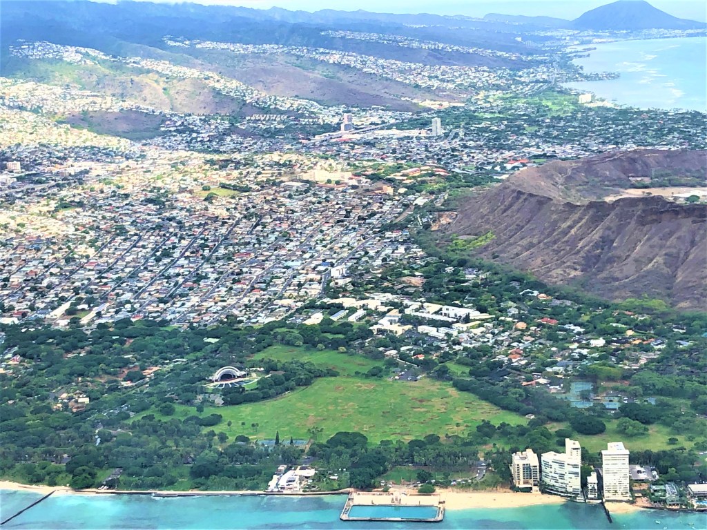 緑の公園はカピオラニパークで、半円の建物はワイキイ・シェル。