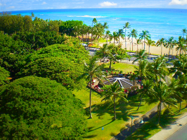 見えるビーチはクウィーンズ・ビーチ。左側の森はホノルル動物園。